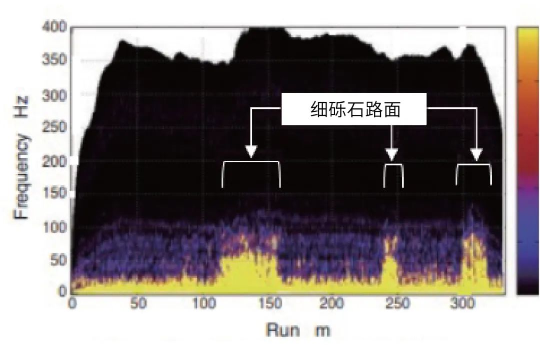 車輪旋轉信號包括輪胎狀況(氣壓等)和路面狀況的影響。通過分析高分辨率的旋轉信號,我們可以更準確地檢測輪胎狀況和路面狀況的差異。例如,當經過一段礫石覆蓋的瀝青路時,轉速變動頻譜如圖3所示。使用這種高分辨率信號可以進一步增強汽車控制的功能。