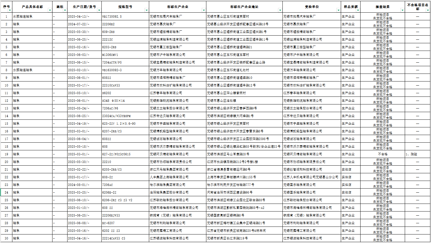 2025年度,無錫市市場監督管理局對軸承產品質量進行了監督抽查。共抽查產品30批次,不合格產品1批次,不合格發現率為3.3%。